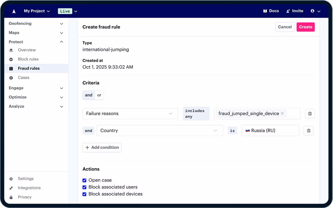 Out-of-the-box rules to detect location spoofing, bonus abuse, account takeover, and much more. Or, easily create your own custom roles.