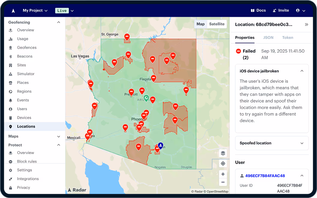 Radar Protect is a next-gen geo-compliance and anti-fraud solution for gaming, financial services, marketplaces, and more.