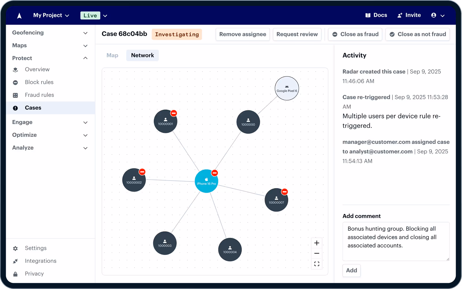 Use our powerful case management system to investigate fraud cases and identify patterns. Or, enable turnkey integrations to send fraud cases and signals to your own systems.